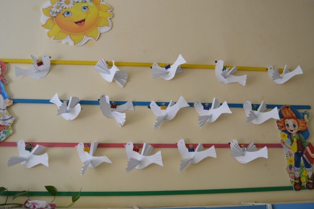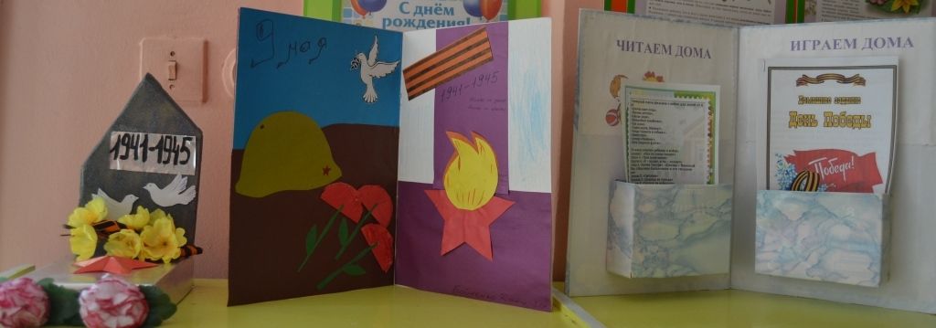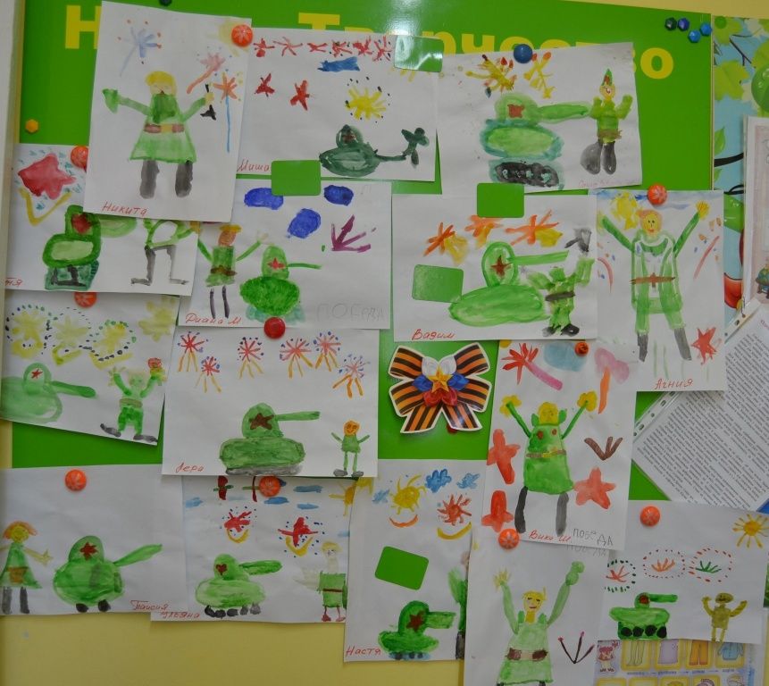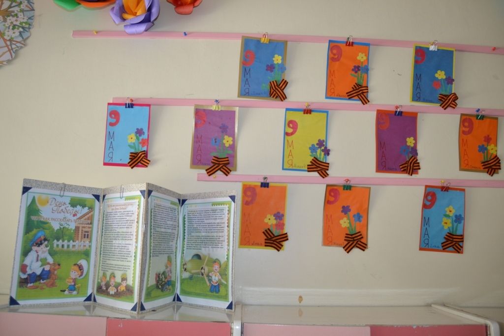 В каждой группе оформлены выставки детских работ - рисунки, открытки, макет Вечного огня, белые голуби – символы мира…
