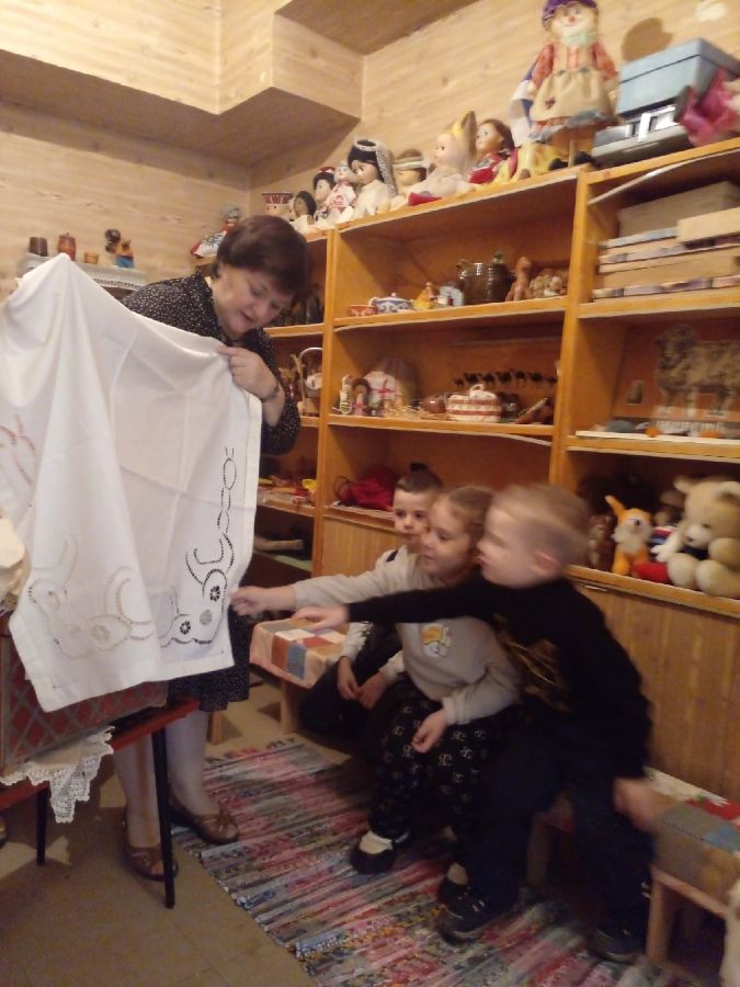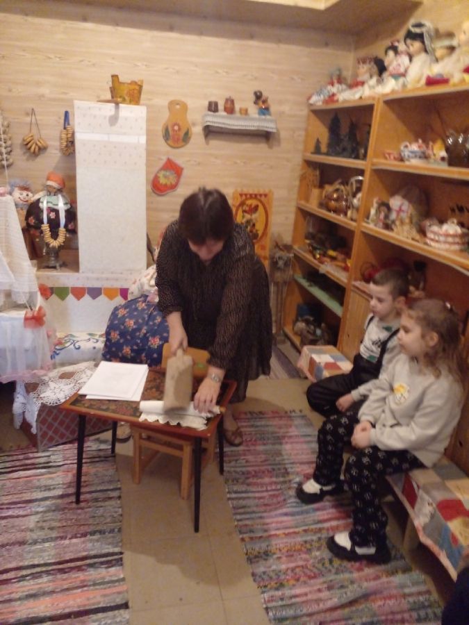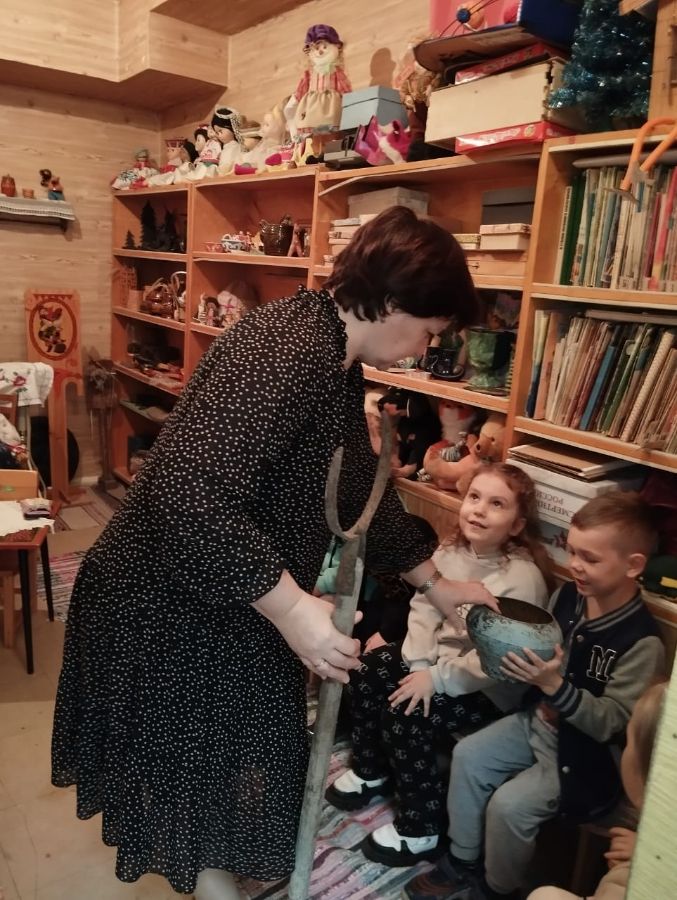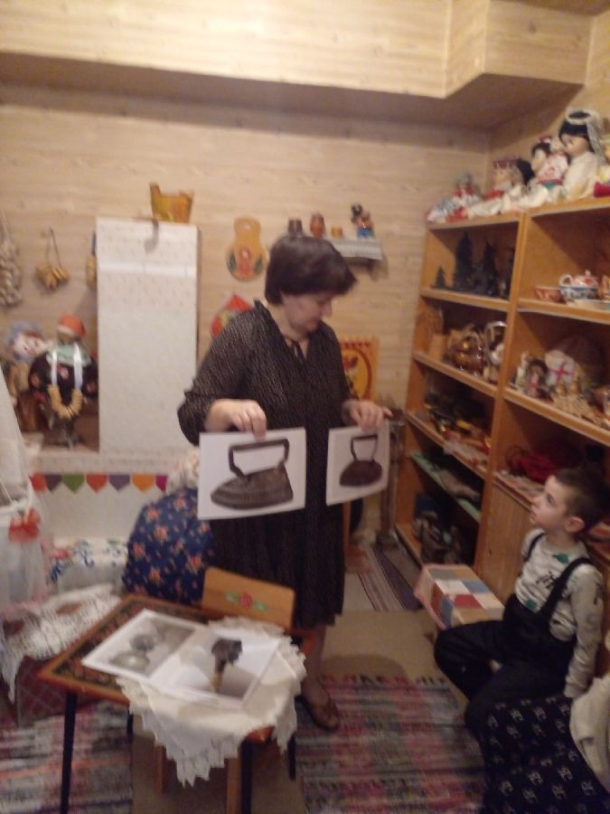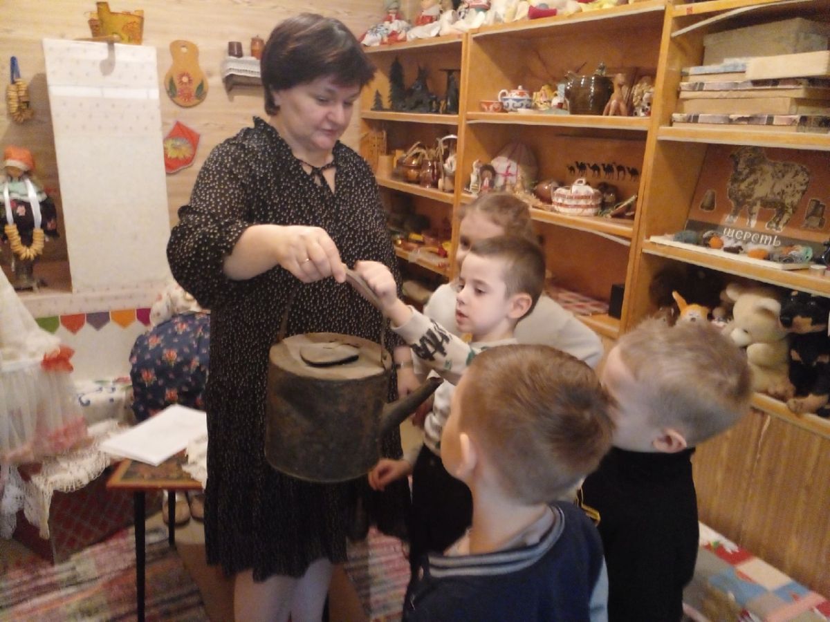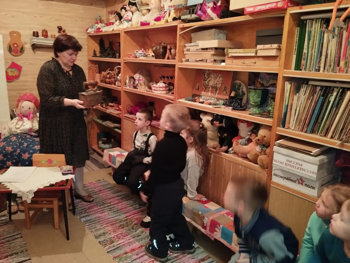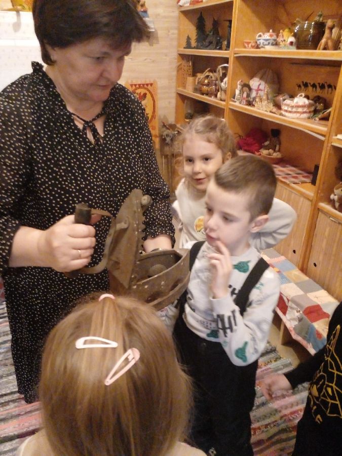 Дети с большим интересом рассматривали старинные утюги, самовары, чугунки, ухват, коромысло, керосиновые лампы, прялку-донце, вышитые и украшенные вязаными узорами полотенца, сундук. Особый интерес у детворы вызвал деревянный рубель – прототип утюга и медный самовар.