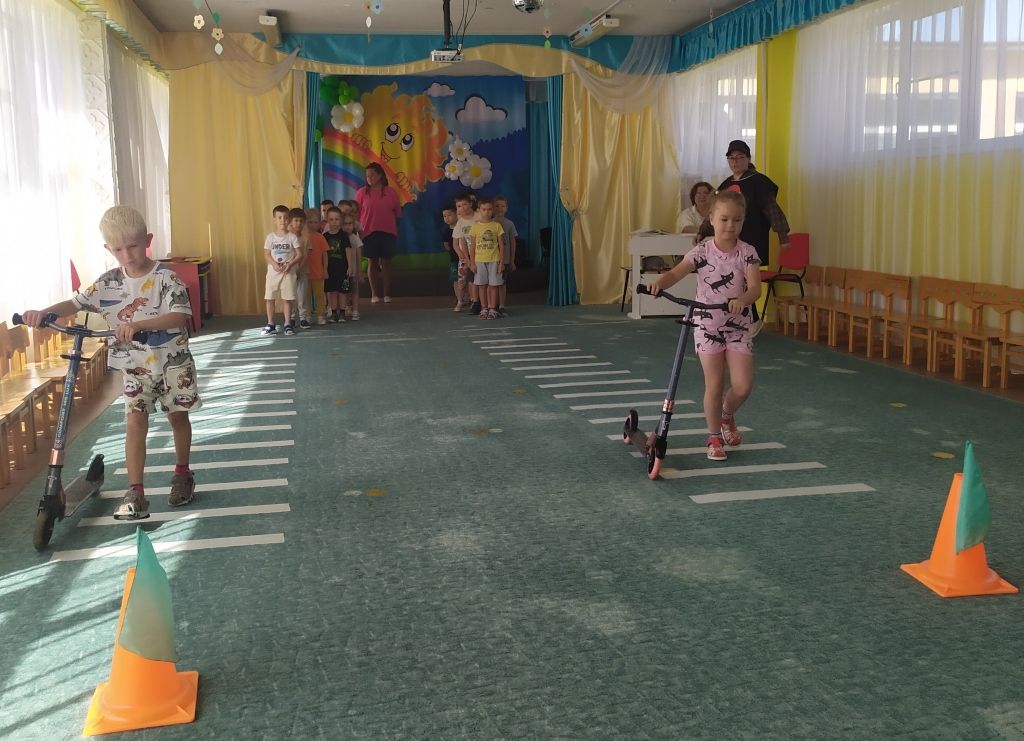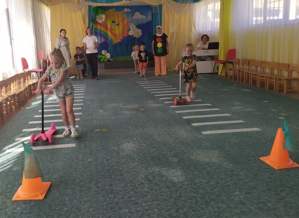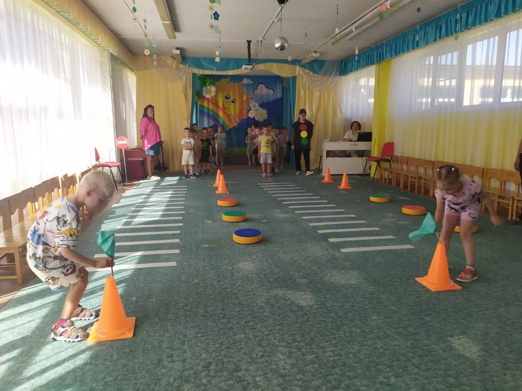 Дети играли в словесные и подвижные игры, приняли участие в эстафетах «Собери светофор» и «Самокат», «Зажги зеленый свет», «Эй, шофер, заводи мотор», отгадали все загадки, исполнили танец «Колесики». А именинника Светофора дети порадовали традиционным танцем «Каравай».
