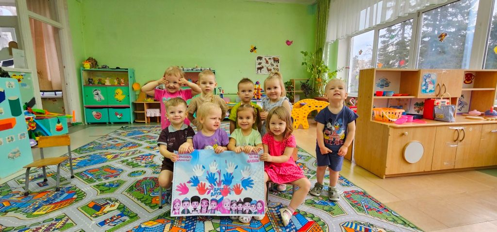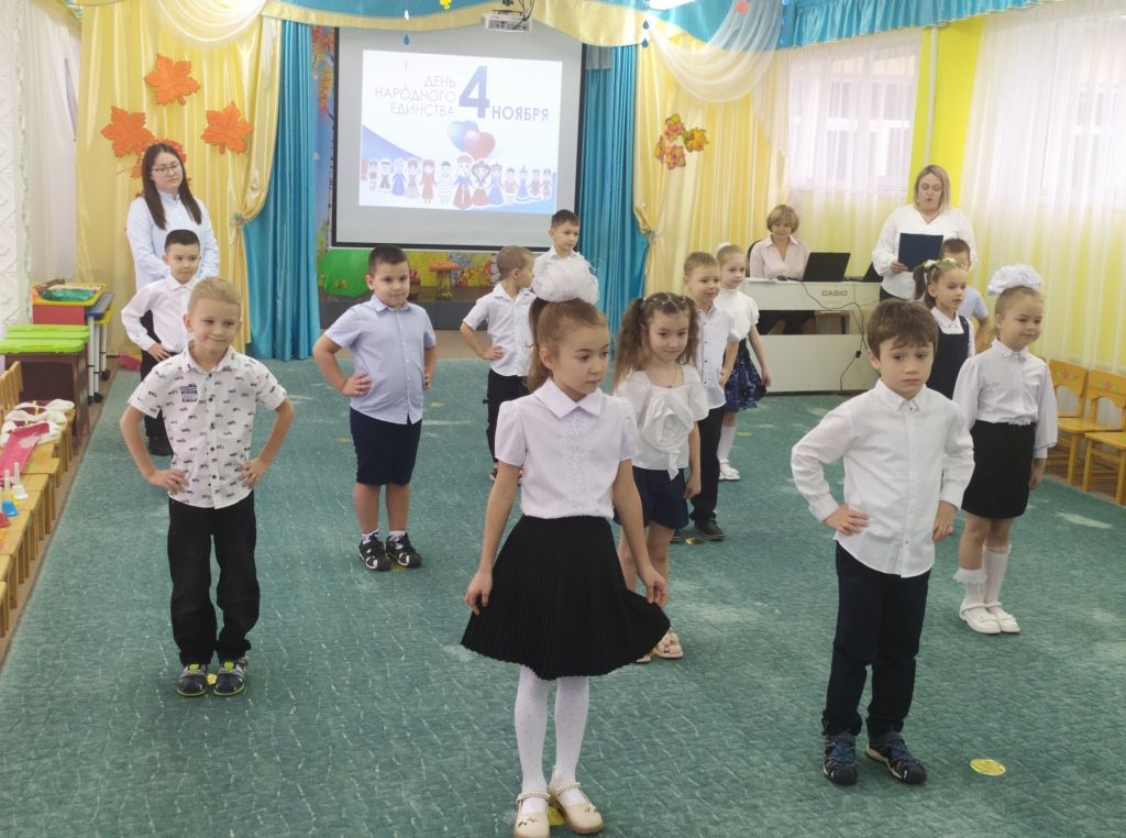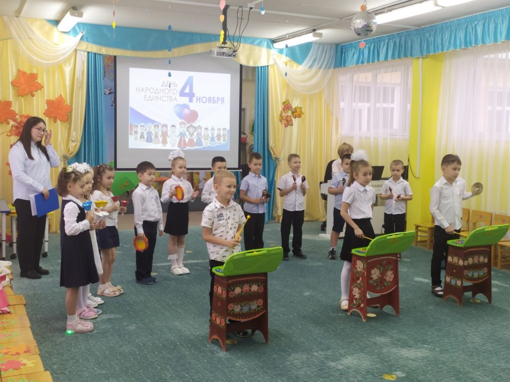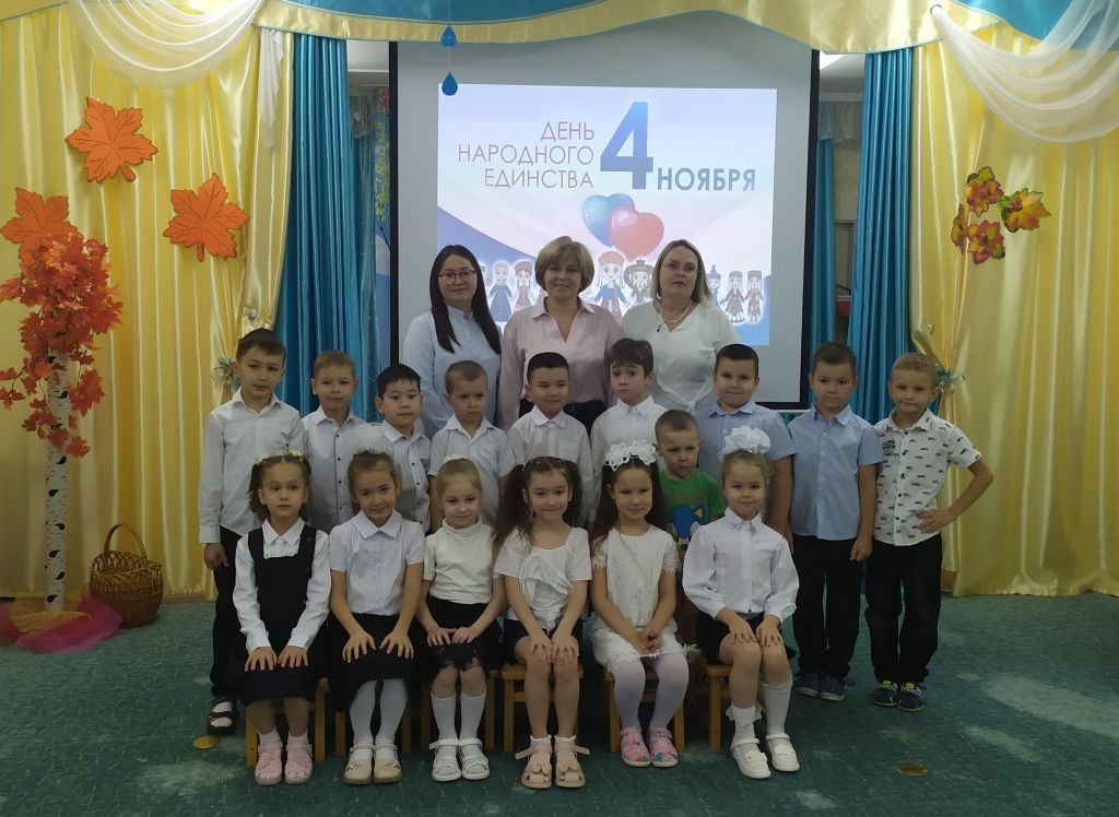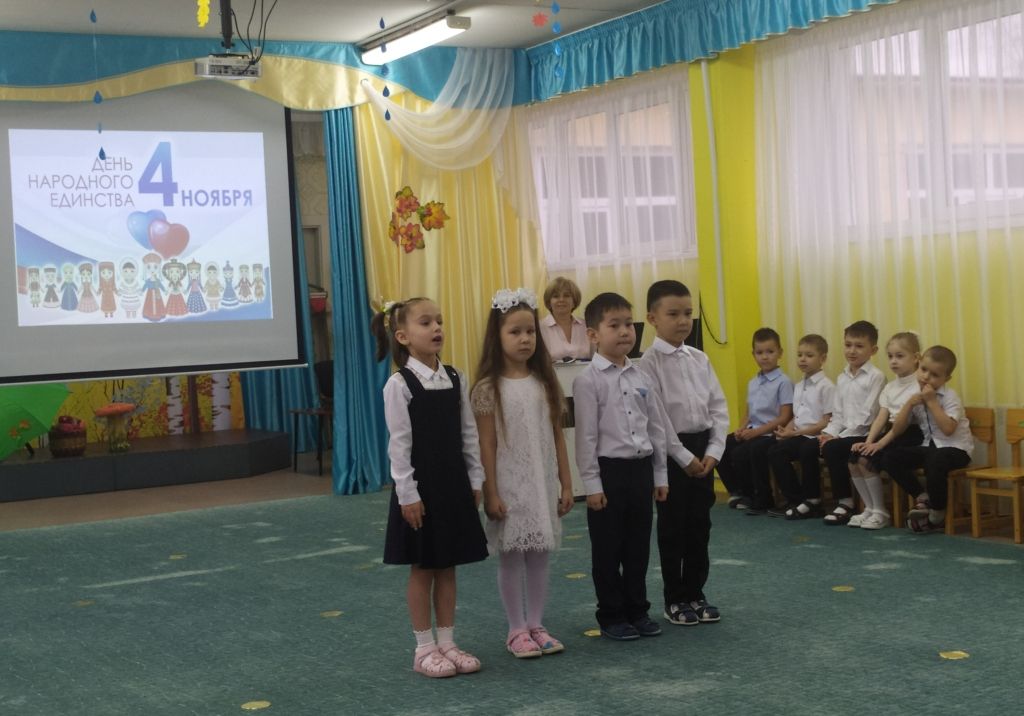 Итогом этой подготовки стал музыкальный праздник, который прошёл в праздничной и торжественной атмосфере в подготовительной к школе группе № 5. Ребята вспомнили государственные символы (Герб, флаг), стоя послушали Гимн нашей страны, исполнили песни о родном уральском крае, об осени. Прочитали стихи о дружбе народов, вспомнили пословицы о дружбе народов.