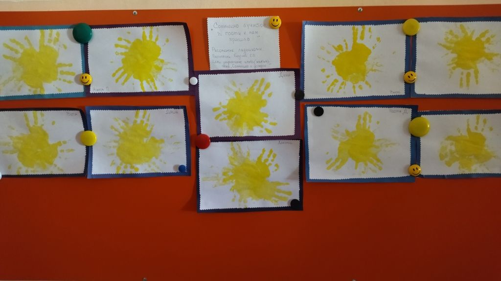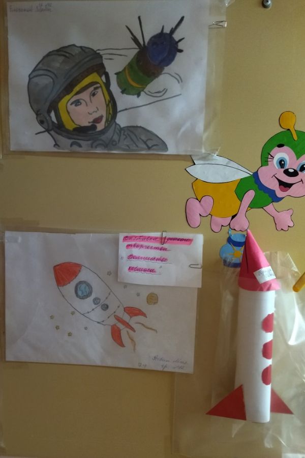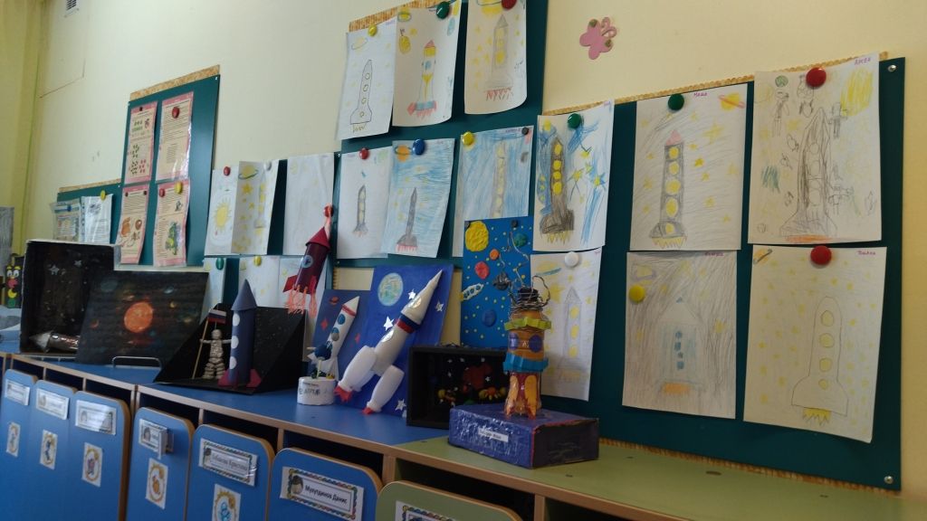 Особенно интересно прошло занятие «Что получилось из фигур?» в группе №14. Девочки и мальчики в игре подбирали предметы по схеме, и вот чудо!... - получился настоящий космический аппарат! Итогом познавательной игры «Космические тайны» в группе №13 стал просмотр 3-D движущихся картинок из энциклопедии «Вселенная и космос». Самые маленькие детишки группы №11 с помощью нетрадиционной техники нарисовали небесное светило. А выставку назвали «Солнышко лучистое в гости к нам пришло».
