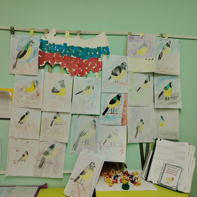 После такого интеллектуального марафона настало время для творчества. Ребята взяли в руки цветные восковые мелки и карандаши, чтобы создать портреты виновниц торжества. Но это было не просто раскрашивание! На раскрасках были цветные образцы, и задача была – повторить настоящий наряд синички. Дети с большим старанием подбирали оттенки: ярко-желтую грудку, изумрудно-зеленую спинку и шапочку, а также знаменитые белые щечки. Работы получились не просто красивыми, но и очень «научно точными»!