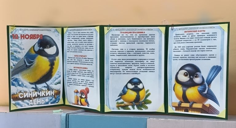 В холле детского сада и в групповых родительских уголках размещена информация про синичек и других птиц – и интересные факты, и история праздника.