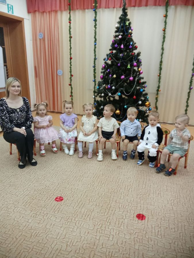 Очутившись в ярком, нарядном, украшенном зале, дети погрузились в атмосферу сказки. Малыши групп 11 и 12 водили у ёлочки хоровод, рассказывали стишок, и спели для неё песни «Возле ёлочки» и «В лесу родилась ёлочка», поиграли в игры «Снежки», «Погремушка».
