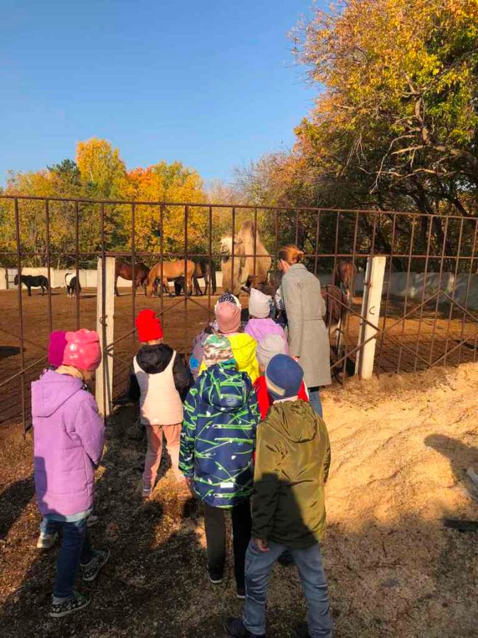 Ещё мы увидели много красивых лошадей, ослика и верблюда. Оказывается, верблюд – девочка и зовут ее Жасмин. Вика Фабер заметила, что зовут ее, как принцессу из мультфильма «Алладин». Дети с большим интересом наблюдали за поведением животных и внимательно слушали рассказ педагога.