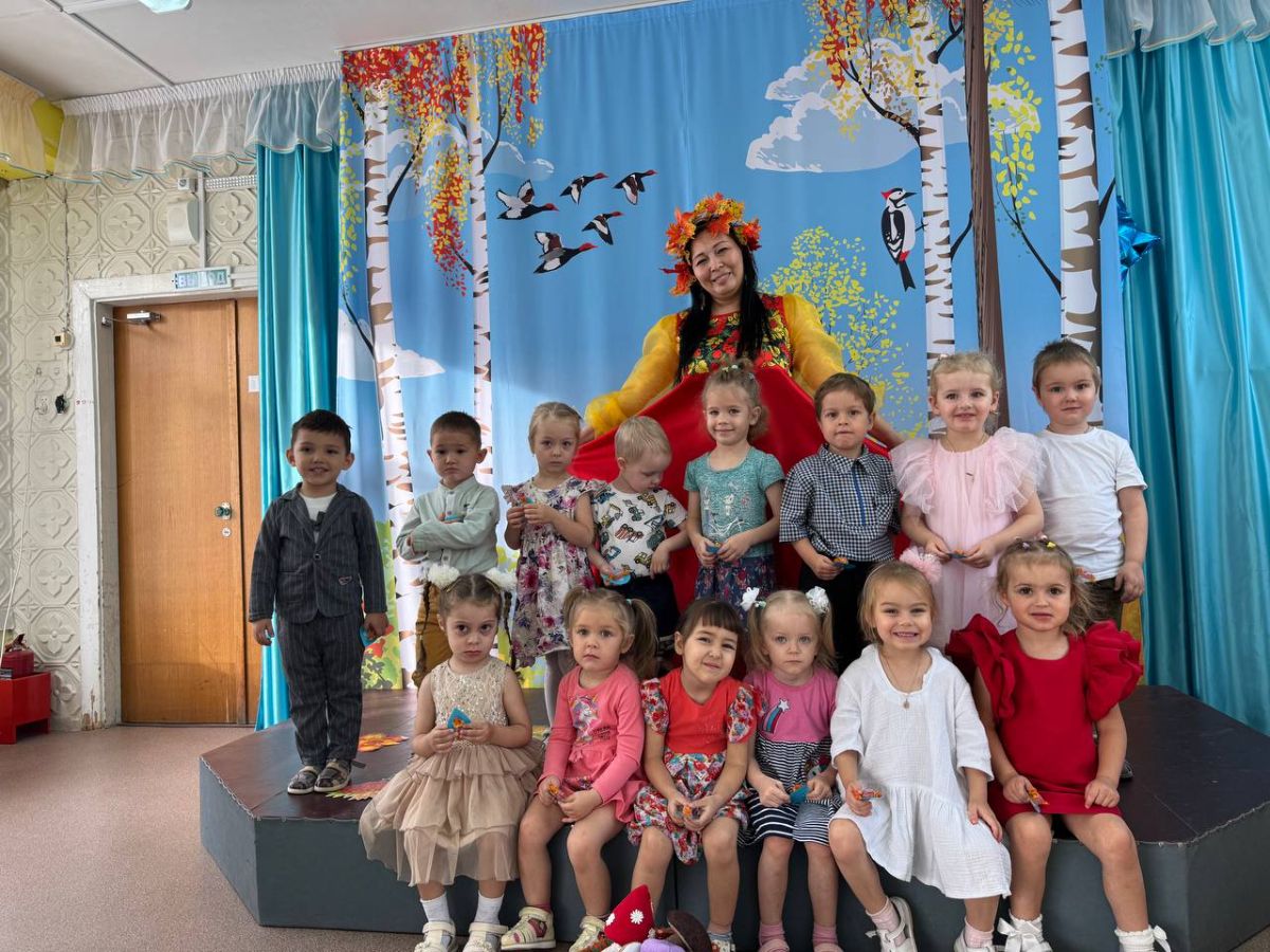 К ребятишкам ясельных групп в гости приходила красавица Осень, вместе с ней они пели песни, танцевали с листочками, прыгали, как зайки, прятались от дождика и играли на музыкальных инструментах.