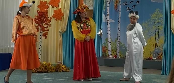 Дети вошли в зал под красивую музыку, прочитали стихи, исполнили песню «Осень наступила». Под веселую игру «По лесным дорожкам» дети попали в лес, где им повстречалась Лисичка переодетая Осенью. Она хотела обмануть ребят, но дети ее узнали и простили, даже исполнили для нее танец «Грибочки». Лисичка помогла детям позвать Осень. Для Осени дети читали стихи, исполнили хоровод «У березки нашей», поиграли в игры «Огород», «Ежик». Спели песни «Осенью», «Ежик колкий».