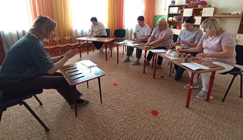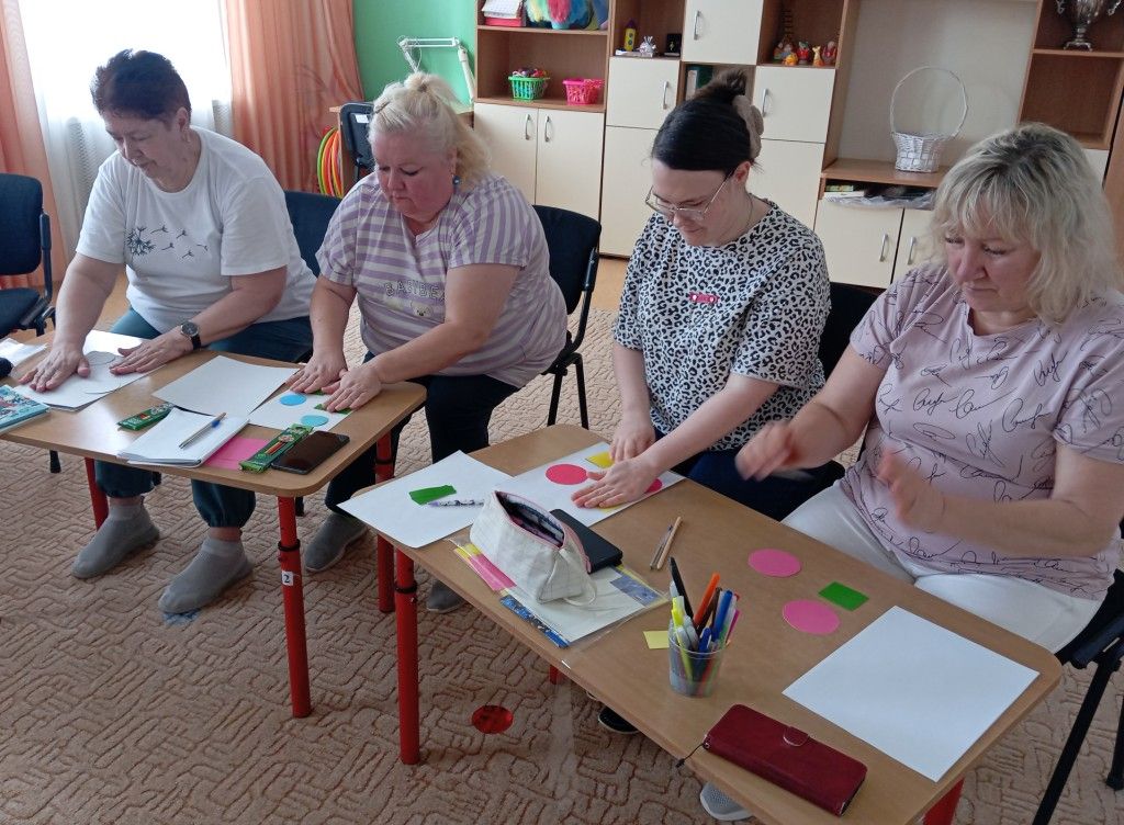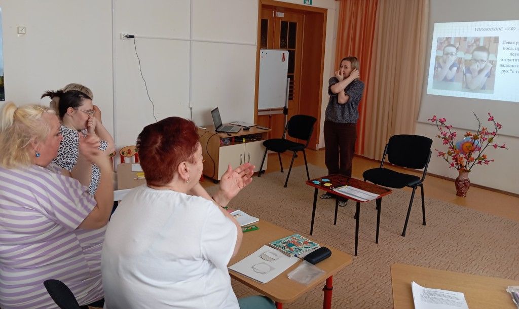 Во второй практической части педагоги выполнили нейродинамические упражнения общей и пальчиковой моторики, а также упражнения с использованием карандашей и геометрических фигур. Познакомились с кинезиологическими рисунками, а также с пособиями «Нейродинамический круг», «Дорожки» и «Зазеркалье». Всем присутствующим были даны рекомендации и консультативный материал с методическим и графическим содержанием.