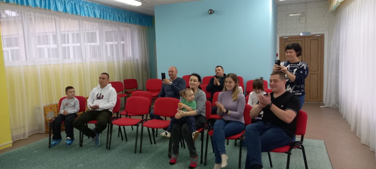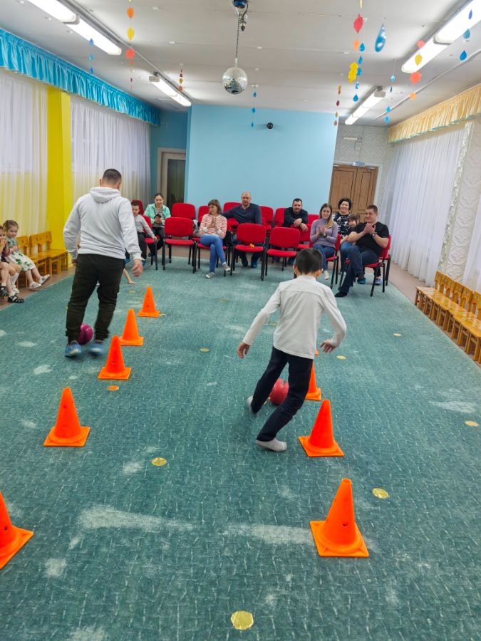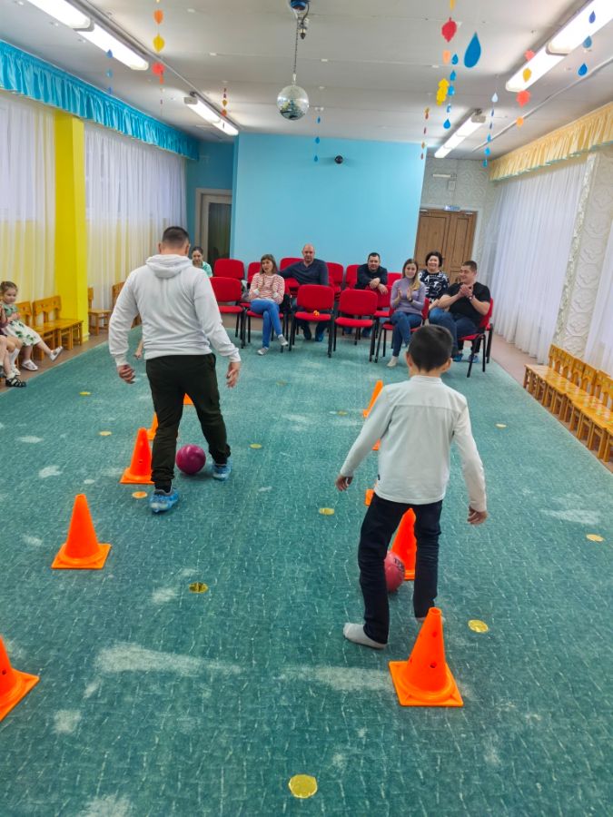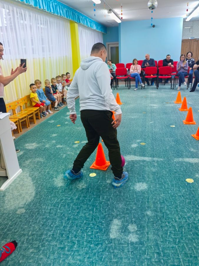 Особое внимание вызвали спортивные соревнования. Дети и папы показали невероятную ловкость и быстроту, продвигая ногами мяч «змейкой» между колпачками, а зрители поддерживали их «кричалками» и громкими аплодисментами.