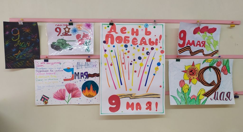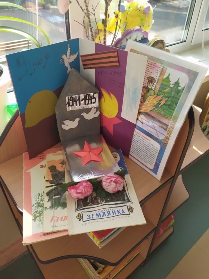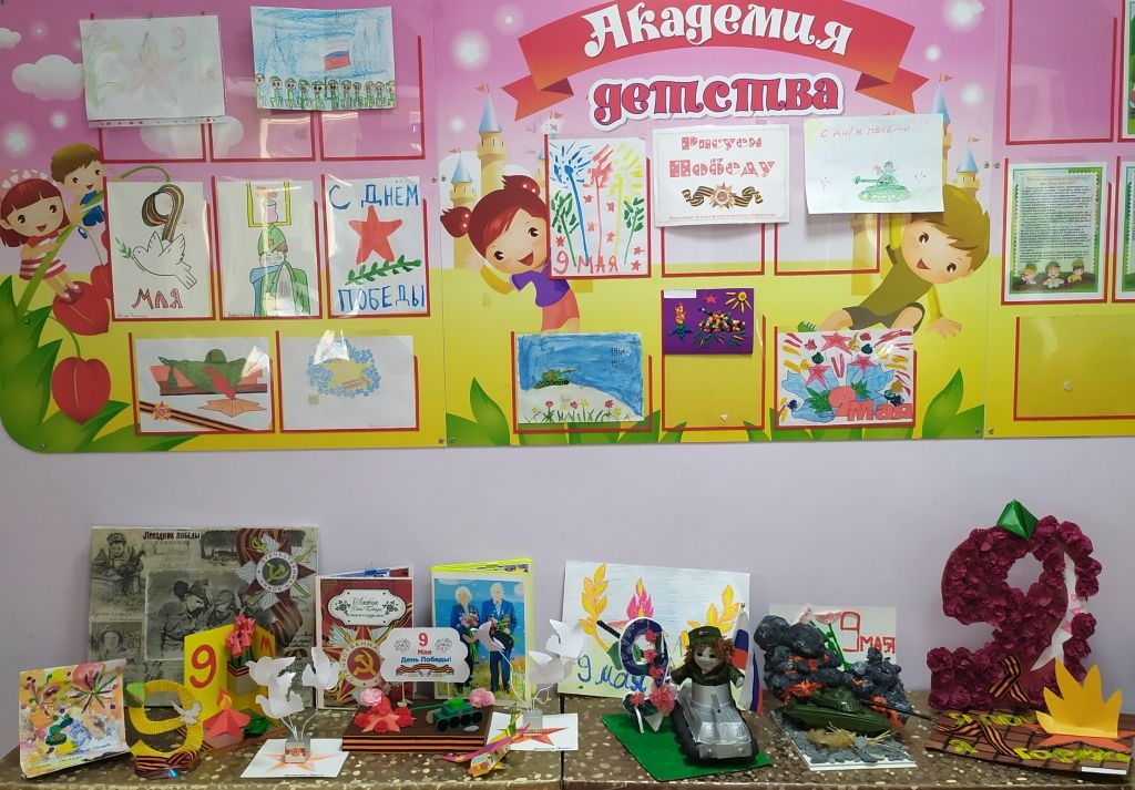В группах были проведены тематические занятия и беседы «Георгиевская лента – символ Дня Победы», «Военная техника, рода войск», «Великие битвы», «Дети и война», «Герои моей семьи», «Праздник со слезами на глазах». В книжных уголках оформлены тематические выставки. Ребята рассматривали иллюстрации, открытки, картины военной тематики; слушали рассказы о суровых военных днях, о подвигах солдат Великой Отечественной Войны и сами составляли рассказы о своих прадедах, разучивали стихи, посвященные Дню Победы; слушали песни военных лет. В группах оформлены выставки детских рисунков и поделок «День Победы»