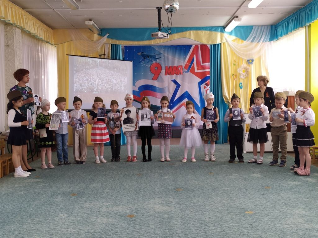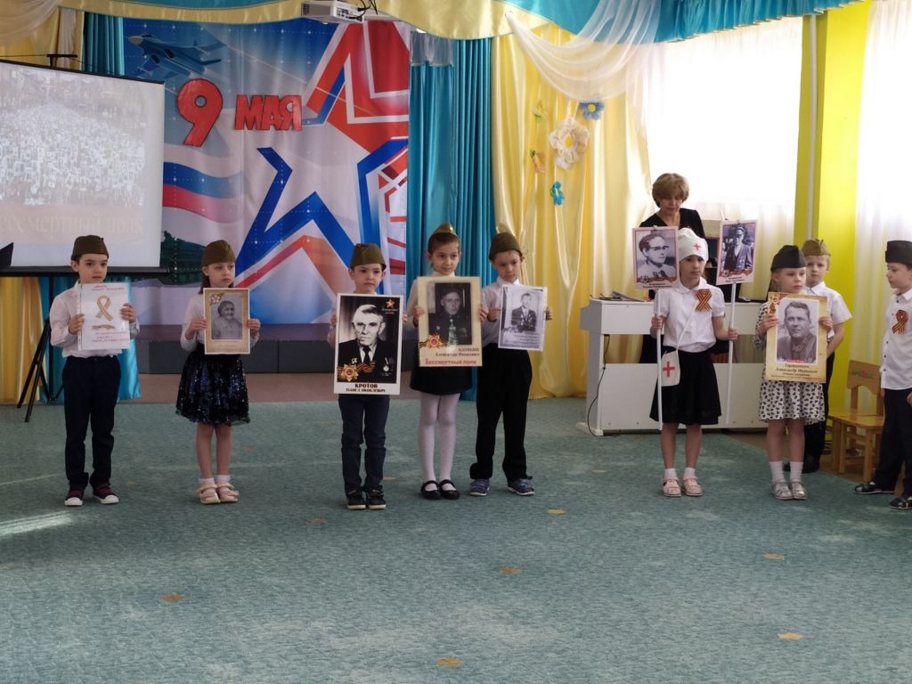 На минуте молчания дети бережно передавали из рук в руки частичку Вечного огня. Сотрудники и дети с портретами «Бессмертного полка» в руках, рассказали о своих дедах и прадедах, которые участвовали в Великой Отечественной войне. Очень ценно, что не прерывается диалог поколений и дети знают и осознают историю своей семьи и своей страны.