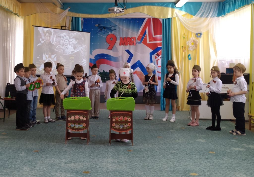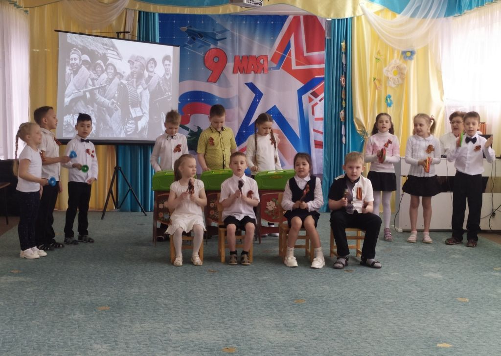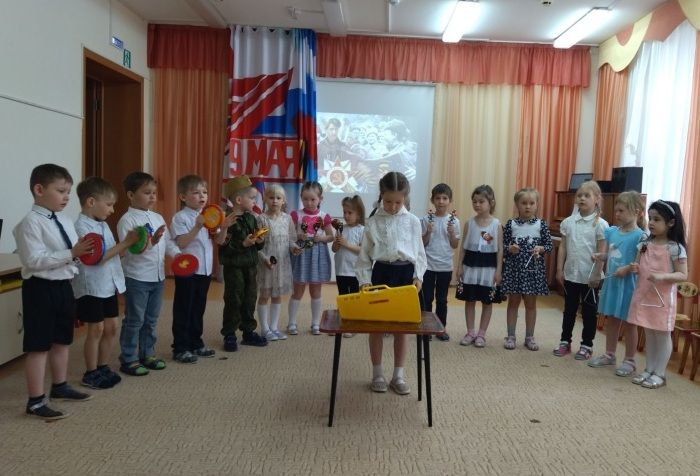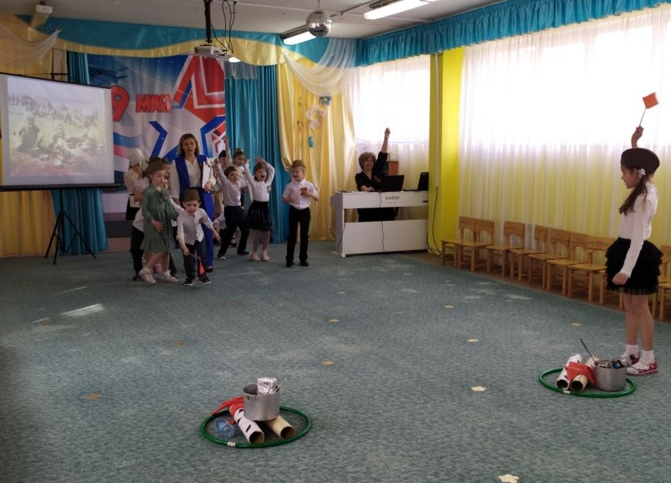 Ребята с большим вниманием рассматривали на слайдах документальные фотографии военного времени, слушали записи песен «Священная война» и «Землянка», сами исполнили песни «Главный праздник», «Три танкиста», «Катюша», «Славный День Победы». Дети читали стихи; вспоминали пословицы и поговорки о войне, мужестве и отваге; на шумовых музыкальных инструментах исполнили попурри на тему военных лет. А игры «Стой, смотри», «Свари кашу» сплотили ребят и подняли их боевой дух.
