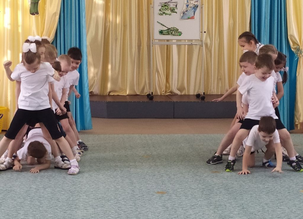 На празднике дети пели песни «Вот мы какие, солдаты молодые», «Бьют барабаны», отгадывали загадки, читали стихи и поговорки об Армии, танцевали танец «Яблочко», с удовольствием играли в игру «Самолет». Интересно и весело прошли эстафеты «Строевые команды», Гусеница», «Меткие стрелки», «Собери снаряды», «Переправа», «Донесение».