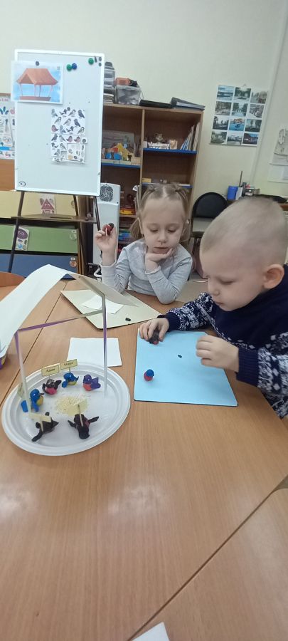 Рассматривали фотографии птиц, сравнивали - искали сходства и различия. Дети увлечённо играли в различные игры: словесные («Назови ласково», «Кто как говорит?», «Угадай по описанию», «Один – много»), дидактические («Половинки», «Кормушка», «Восстанови картинку»), подвижные («Кот и птички», «Птички летают»)