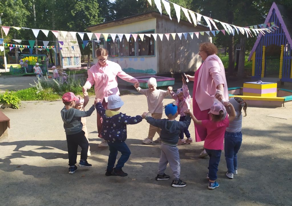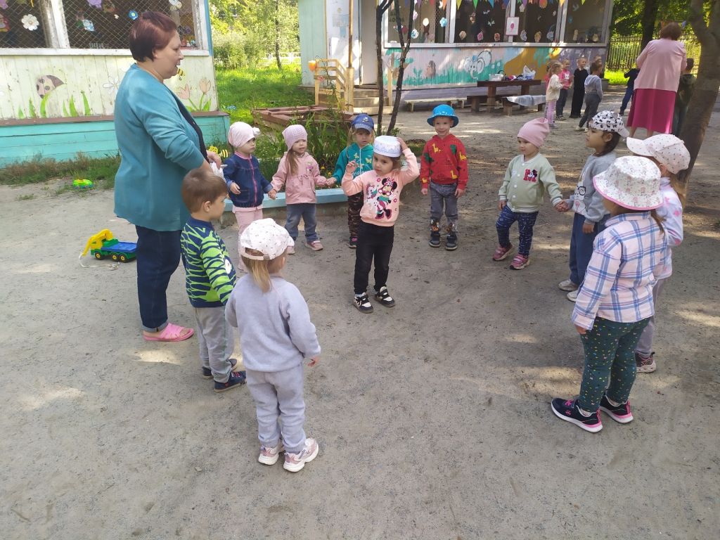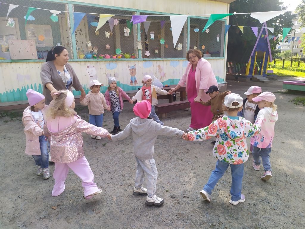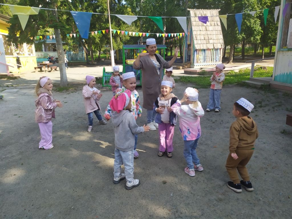 А во время прогулки каждая группа на своём участке под чутким руководством музыкального руководителя Галины Александровны Сергеевой поиграла в русские народные игры «На горе – то калина» и «Золотые ворота», в башкирскую игру «Тюбетейка», татарскую игру «Горшок» и игру народов Сибири и Дальнего Востока «Полярная сова и евражки».