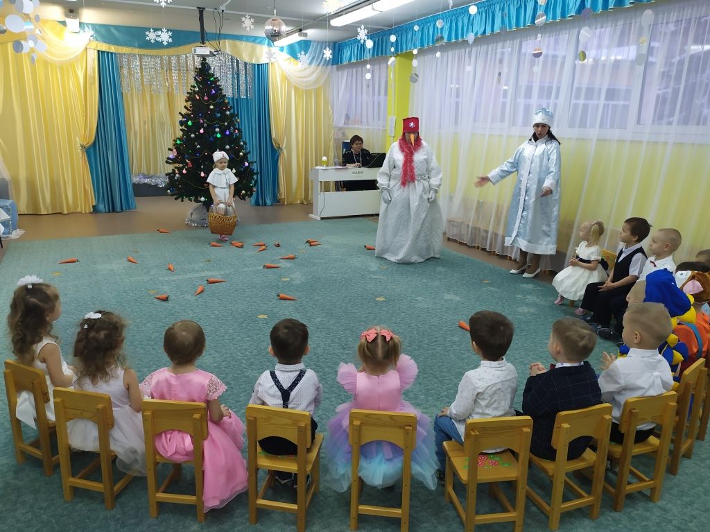 Во 2 младших случилась беда – потерялся носик у Снеговика, но ребята вместе с Зайчиком помогли ему найти любимый носик-морковку.