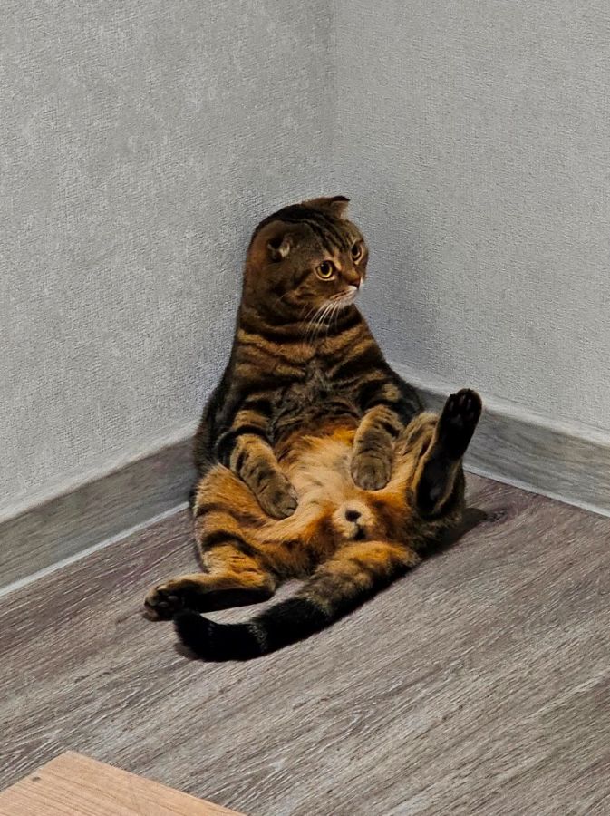 - В очень забавной позе наблюдает за всеми шотландский кот Филя.