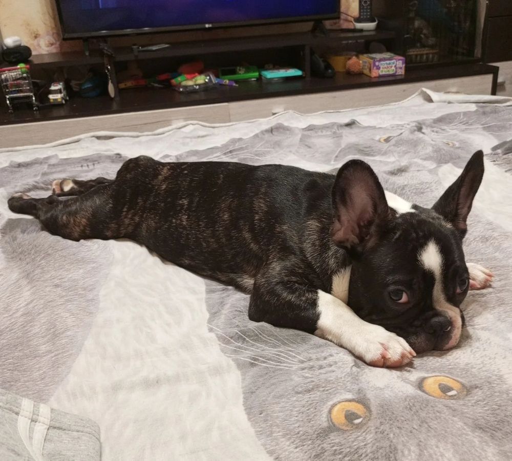- Французский бульдог Арчи любит спать на диване, развалившись «сосиской» и грызть игрушку «соска».