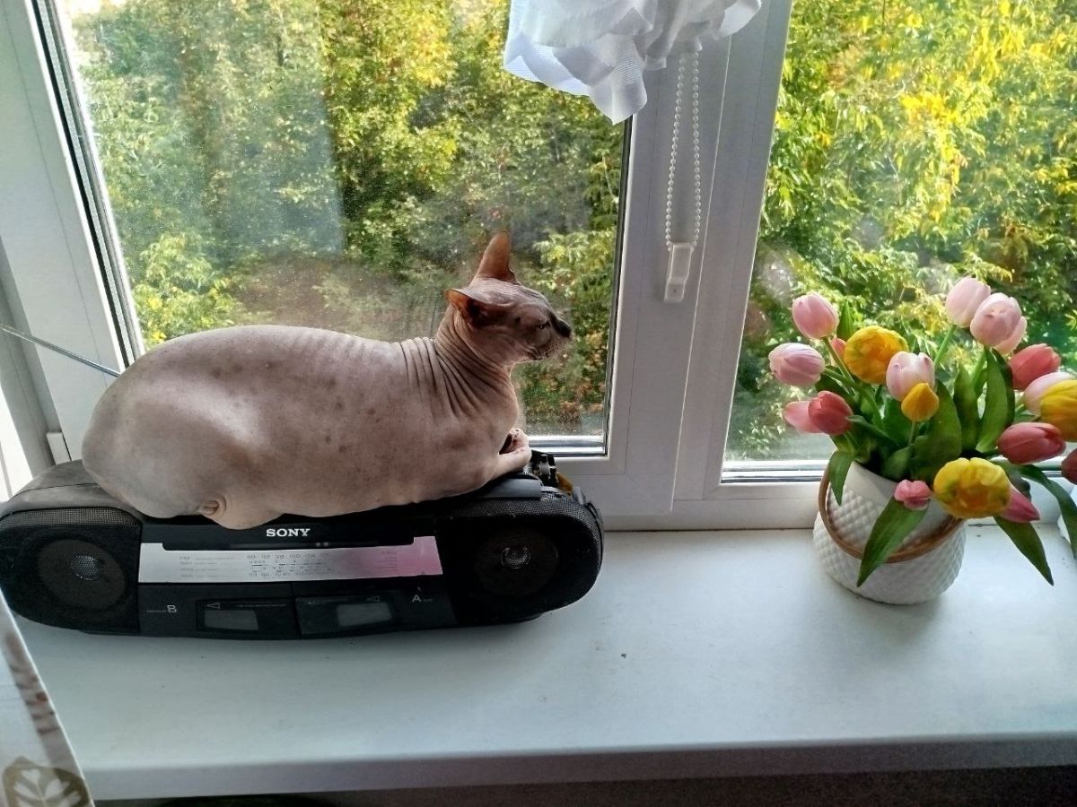 - Немецкий шпиц Аччи и донской сфинкс Боня играют друг с другом, а Боня ещё и музыку слушает.