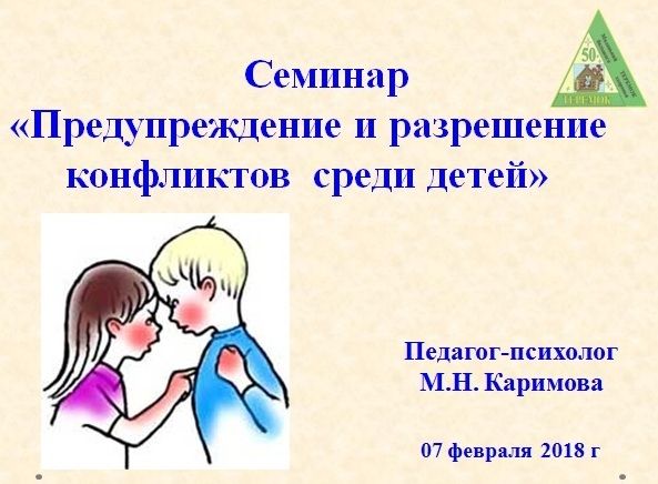 Как научиться эффективно, конструктивно разрешать проблемы межличностного общения, какую профилактическую работу можно проводить в группе - эти вопросы педагоги обсуждали на семинаре « Предупреждение и разрешение конфликтов среди детей», который подготовила и провела педагог-психолог Каримова Марина Николаевна.